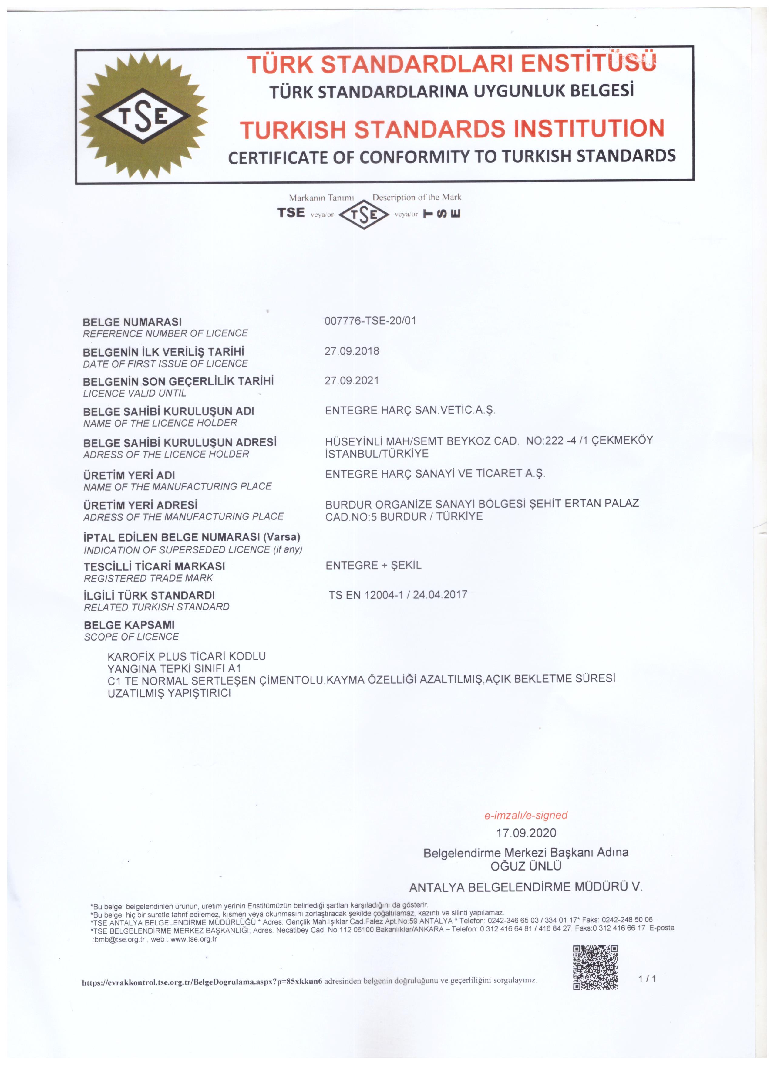 TS EN 12004-1/ C1TE standartına uygunluk gösterir.